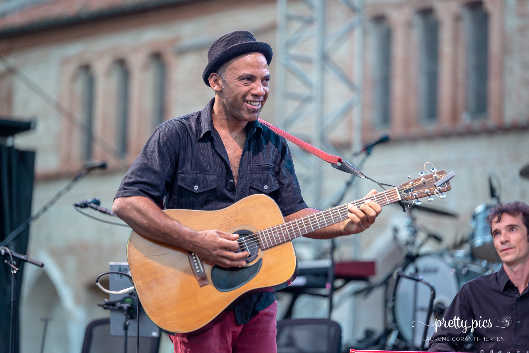 Alors il débarque sur scène, accompagné de ses musiciens Julien Lebars au clavier, Davy Kilembé à la guitare et à la batterie et un sourire vissé aux lèvres.